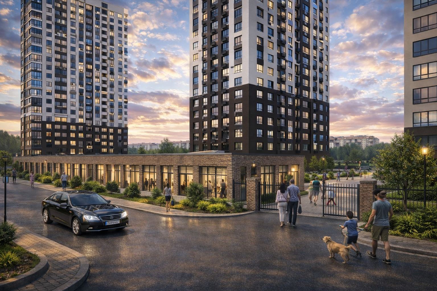 Взмывающие ввысь башни комплекса расположены в зеленом, наполненном жизнью микрорайоне Уфы рядом с ТРЦ «Планета» и станут естественным продолжением лесного массива «Кошкин лес».